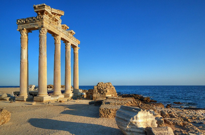 В кінці півострова, прямо біля моря можна побачити руїни трьох Храмів. Найкраще виглядає храм бога краси, сонця, покровителя муз і мистецтва – Аполлона, який є одним із символів Сіде. Від усього храму, який був прямокутної форми, залишилось лише 5 колон.